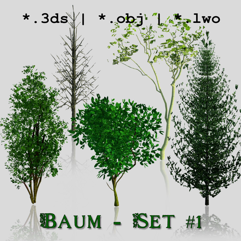 Downloadprodukt. Das Set enthält 5 unterschiedliche Bäume als 3D-Modell in den Formaten 3ds, obj und lwo.
