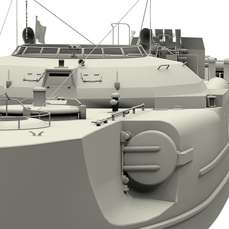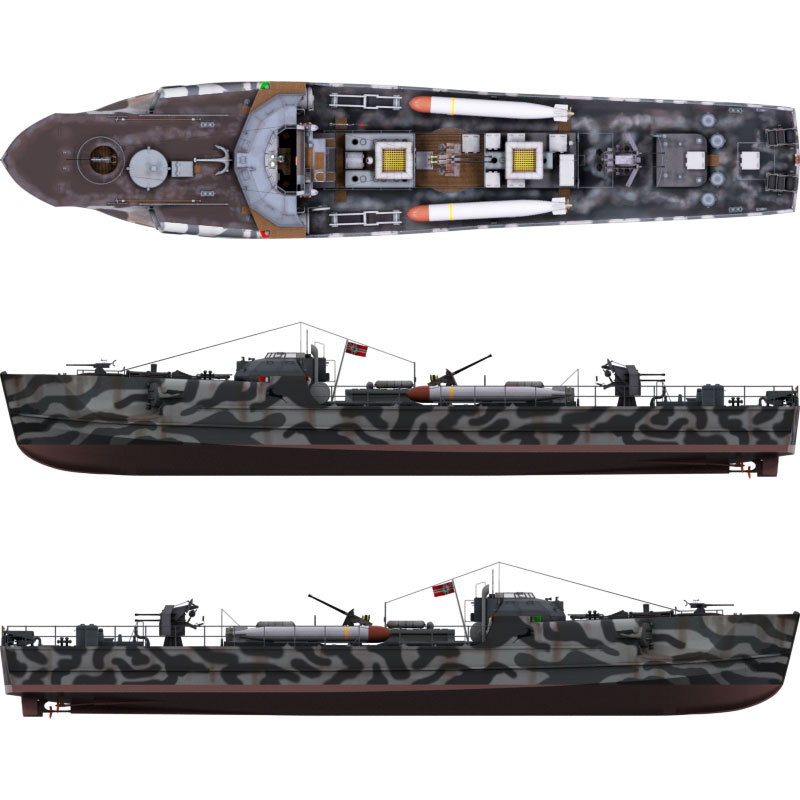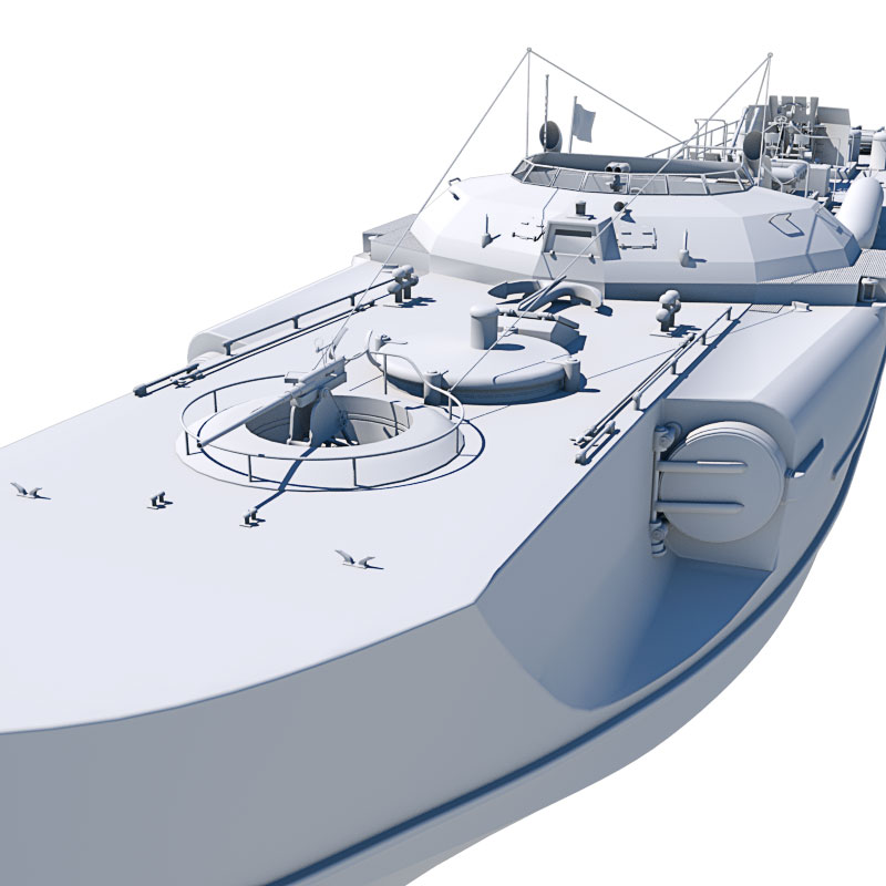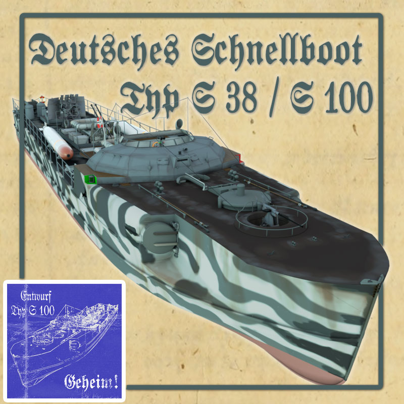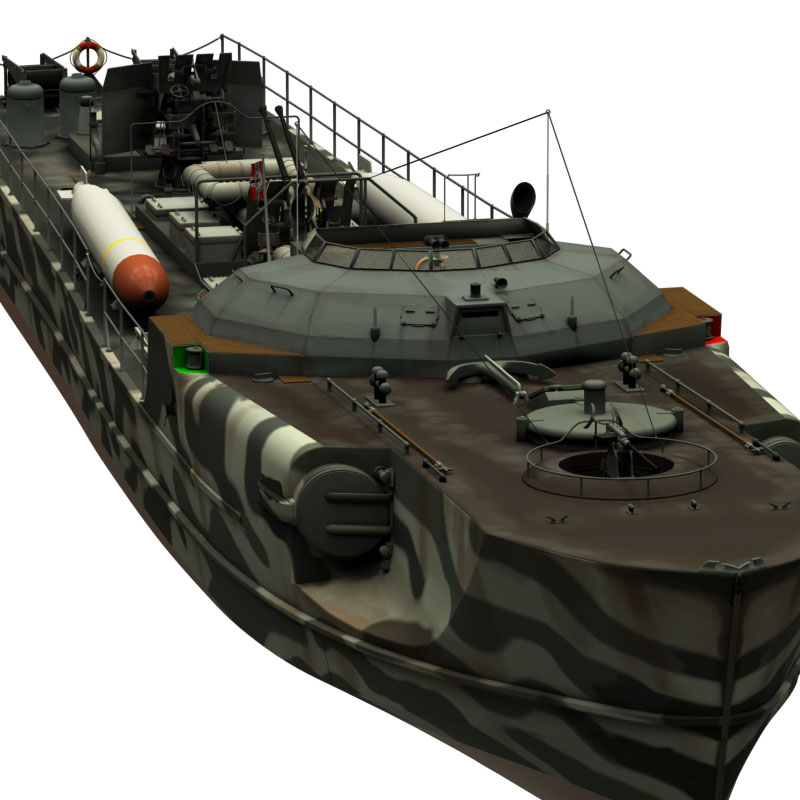 Dieses Schnellboot Typ S 100 ist 3D-Modell eine Schnellbootes/Torpedobootes der deutschen Kriegsmarine aus dem 2. Weltkrieg, basierend auf dem Typ S 38 und Typ S100 in den Formaten obj, c4d, vob und blend. Es liegt kein konkretes Schnellboot dieser Klasse zugrunde. Dies gilt, obwohl das Boot am Heck die Kennzeichnung 103 aufweist und ein fiktives Flottillenwappen trägt.