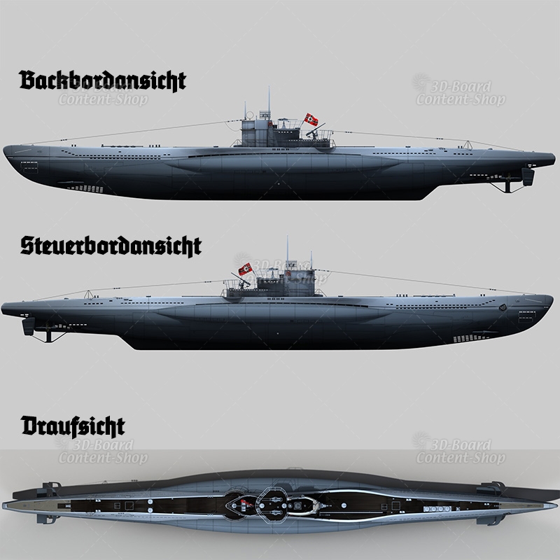 Voraussetzung um das äußerst detaillierte Modell dieses historischen U-Bootes U995 Typ VII C/41 der deutschen Kriegsmarine nutzen zu können, ist ein Programm, das obj oder c4d, oder car, oder vob Dateien importieren kann (z.B. Cinema 4D, Blender, Vue, Bryce, Carrara, modo, Maya, 3ds Max , DAZ-Studio u.a.). Für die enthaltene c4d-Version ist mindestens Version 6 von Maxon Cinema 4D erforderlich. Die enthaltene vob-Version wurde mit mind. Version 7 von Vue erfolgreich getestet. Für die Nutzung beachten Sie bitte unbedingt die Lizenzbedingungen in unseren AGB.